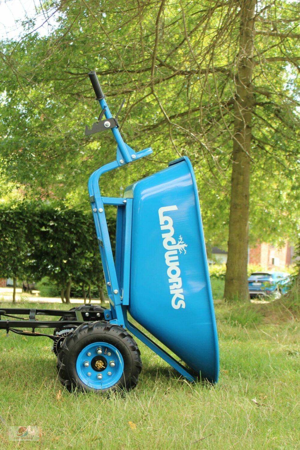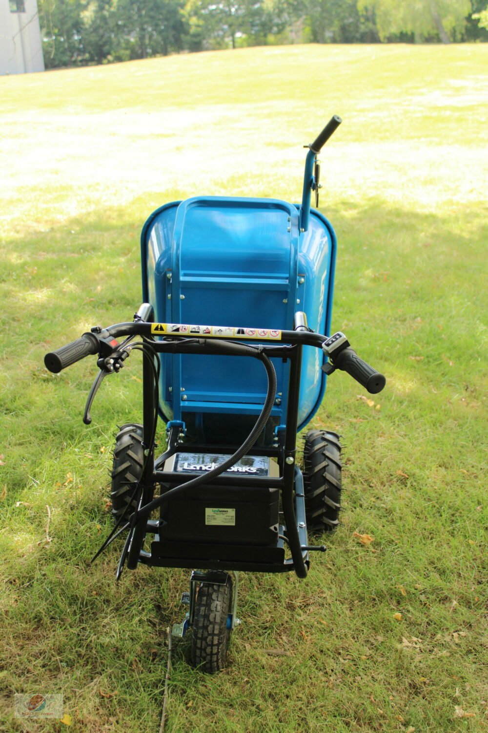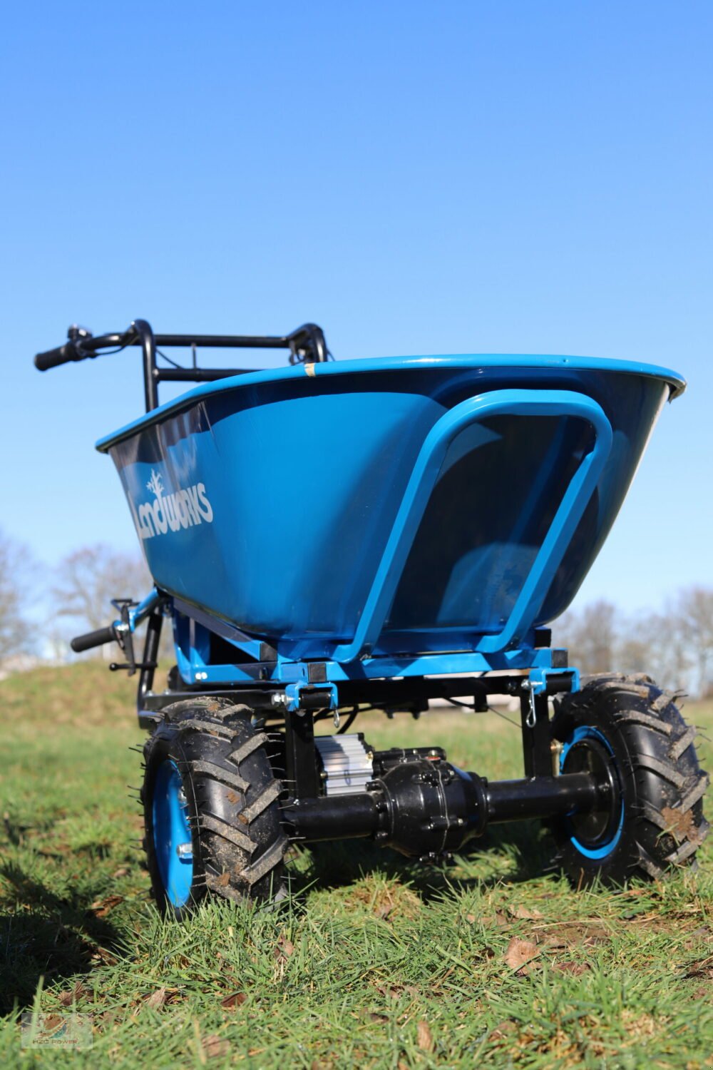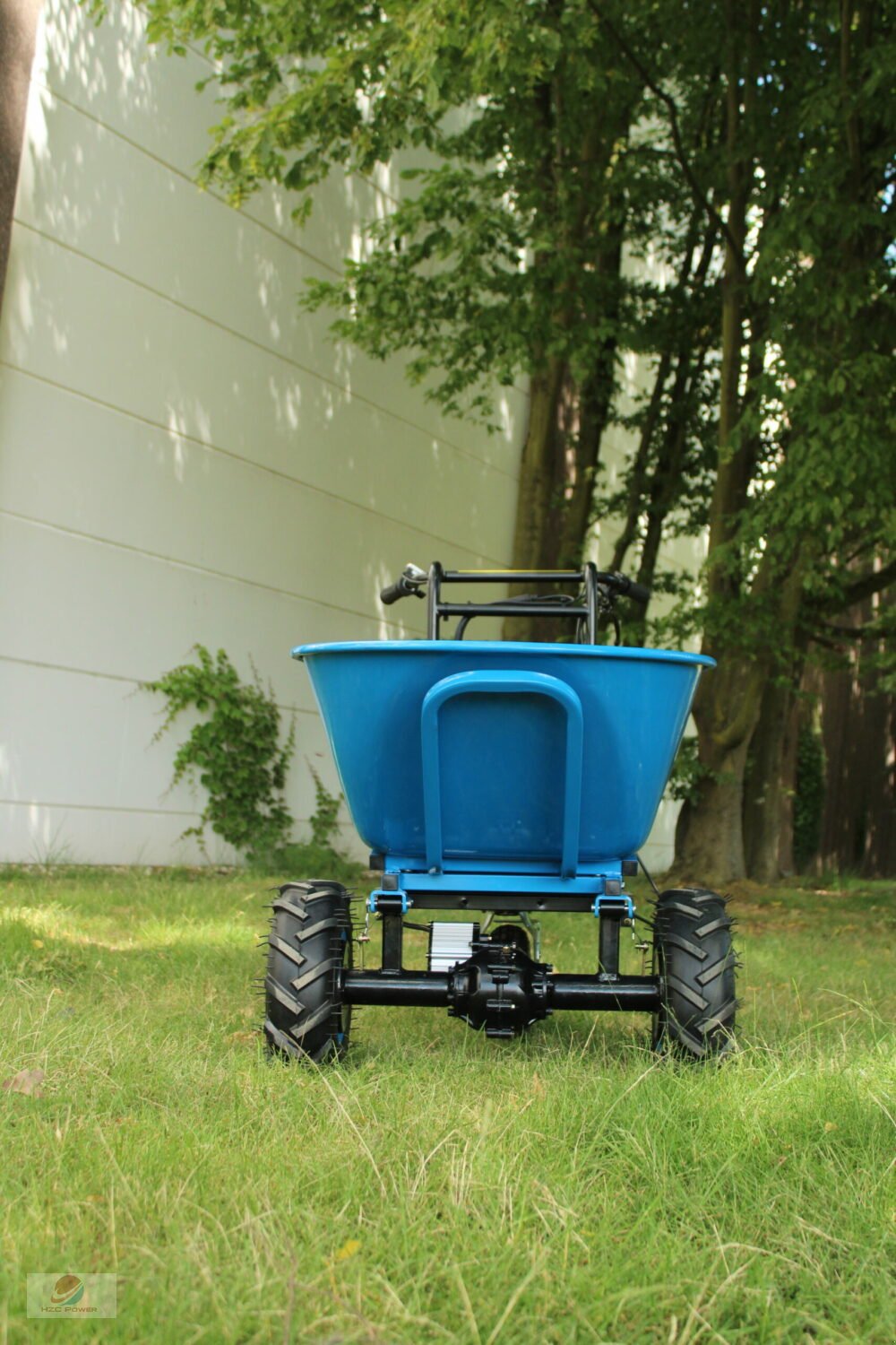 Der E-Antrieb erleichtert den Transport sehr, da kein körperlicher Aufwand nötig ist. Vorwärts erreicht diese Schubkarre eine Geschwindigkeit von 5 km/h, Rückwärts von bis zu 3,5 km/h, wodurch man gut voran kommt.