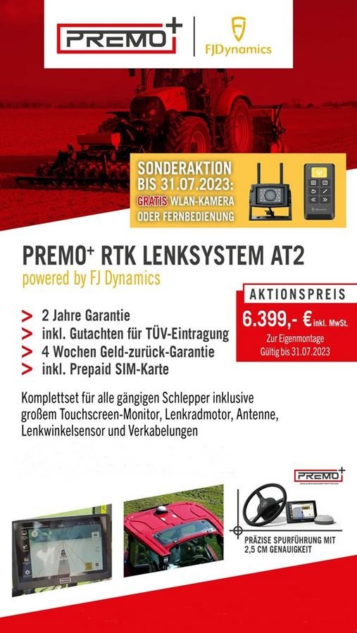Premo+ AT2 RTK-Lenksystem - Komplettset System FJ Dynamics mit Bedienmonitor mit Halterung, Lenkradmotor, Lenkwinkelsensor, Antenne, sämtliche Halterungen und Verkabelungen inkl. SIM-Karte mit 500 MB Startguthaben; eine Spurgenauigkeit von 2,5 Zentimeter und eine Fahrgeschwindigkeit von 0,4 – 20 km/h ist möglich - OHNE Montage
