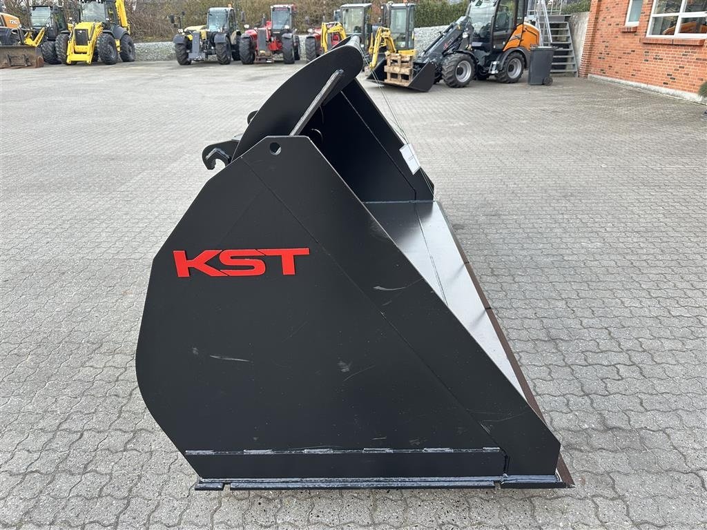 Fed fabriksny KST læsseskovl med Volvo ophæng, fedeste danske kvalitet med for- og bagkant skær, øverste spildkant og krog inde i svøbet.