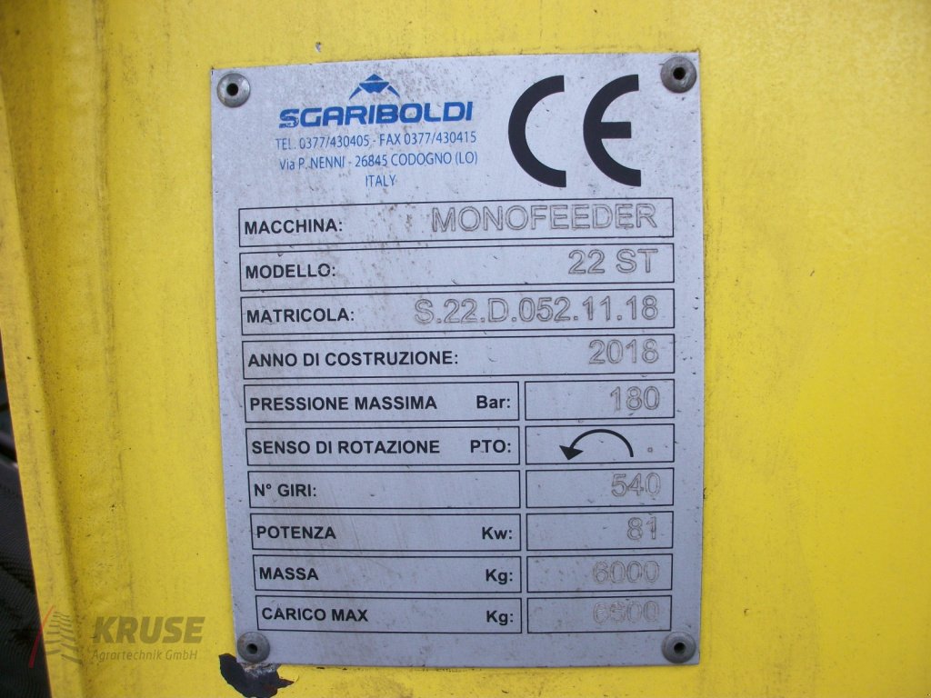 3 PTM-Wiegesensoren mit programmierbarer Waage HL50, Bedienung über Bordhydraulik, verstärktes Getriebe mit zusätzlicher Untersetzung SL3003 MP i=56, Umkehrgetriebe B322, Mischschnecke Ø 1060 mm mit Messern, Gegenschneiden im Wannenboden verschraubt, INOX Edelstahl Doppelwanne, Austrag links mittig mit hydr. Schieber und hydr. Austragekasten (Hydroheber) und hydr. Austragekette, höhenverstellbare Deichsel, mech. Teleskopstützfuß, Niedrige Bauweise mit Flachachse (Gesamthöhe: 2850 mm), Singleachse mit Bereifung 385/65 R22.5 und Feststellbremse, Zweileitungs-Druckluftbremse mit Regelventil, Kraftfutterschütte und Aufstiegsleiter am Heck, Gummiaufsatz links, Beleuchtung mit Schutzrahmen, Gelenkwelle