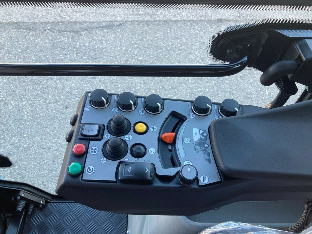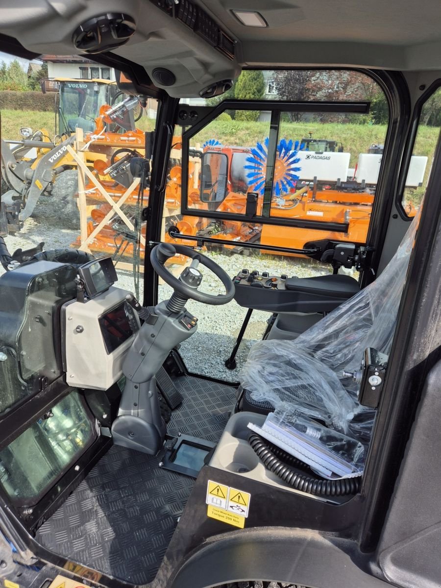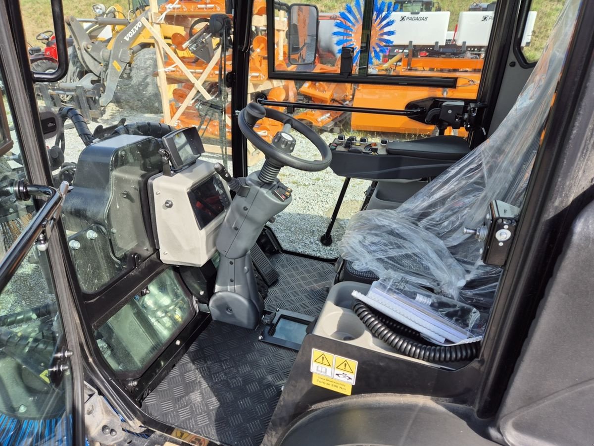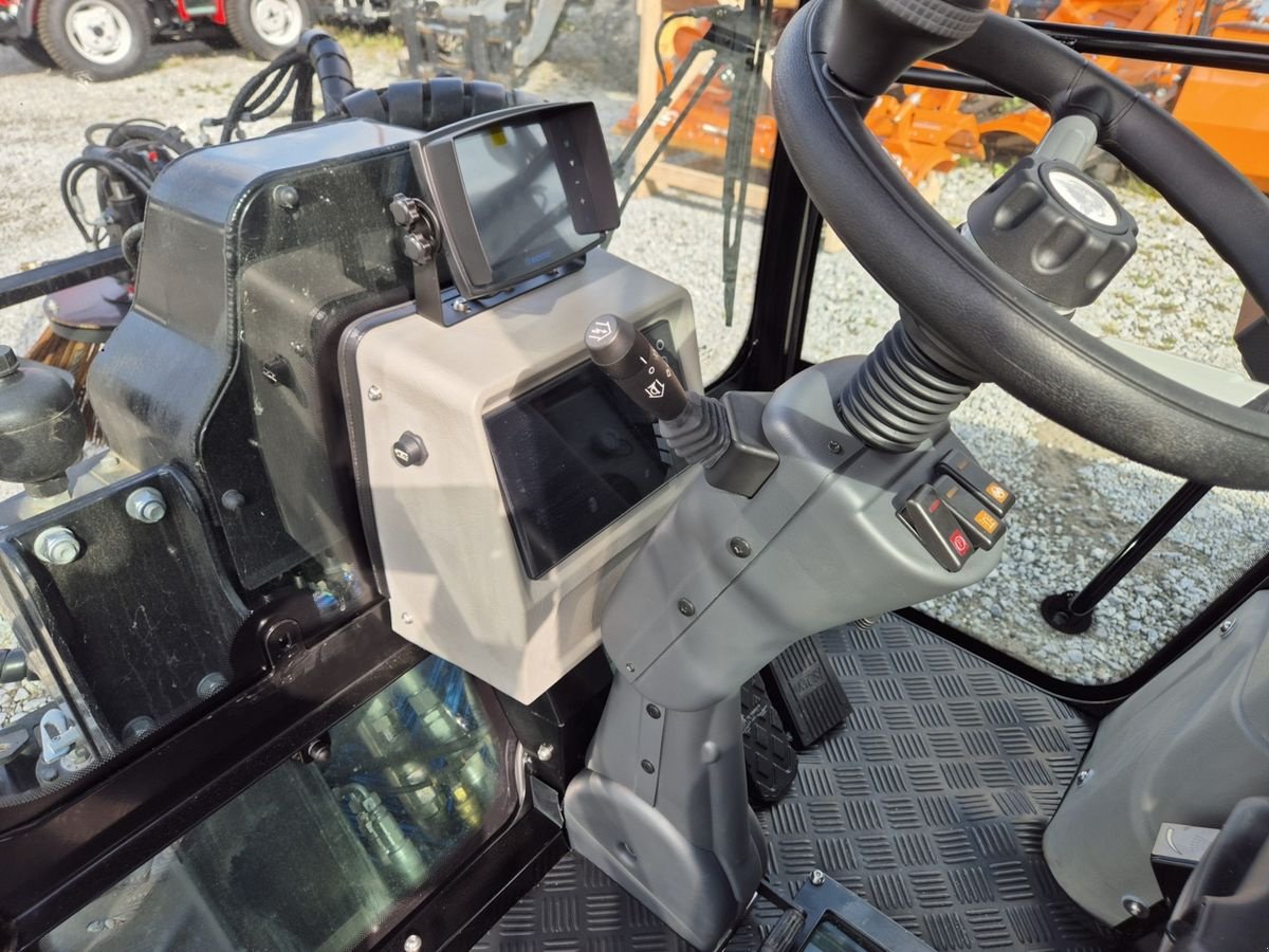 Alle Anwendungen und Anbaugeräte können zentral über die Armlehne gesteuert werden. Beim klassischen Anbau der Kehrmaschine könnten so beispielsweise die Bürsten unabhängig voneinander gesteuert werden. Auch der Anbau einer dritten Bürste ist möglich. Trotz der vielen Möglichkeiten wurde darauf geachtet die Bedienung einfach zu halten. So kann mit nur einem Knopfdruck vom Kehrantrieb auf den Fahrantrieb umgestellt werden. Ein 200 Liter Tank mit Wasser sorgt dafür, dass beim Kehren der Staub nieder gehalten wird während der Anwendung. Die Federung der Kommunalmaschine wird auf die viel Räder verteilt. Jedes Rad hat ein unabhängiges Feder- und Dämpfsystem.